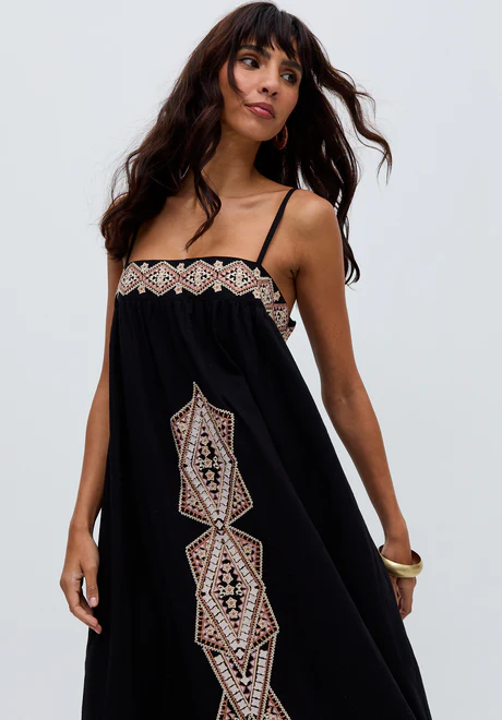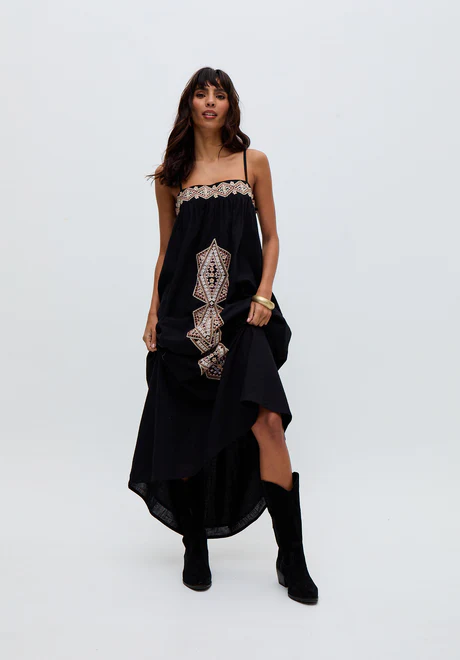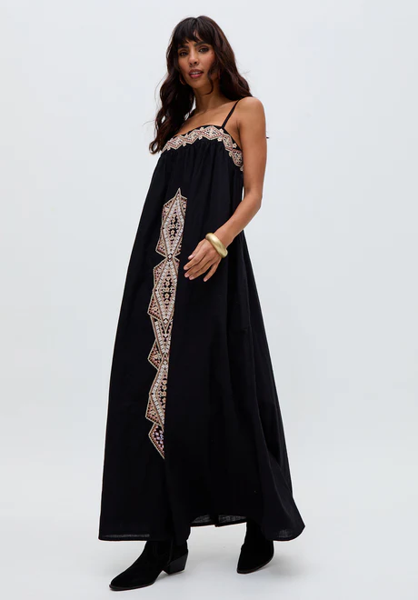 Black maxi dress with sapphire spaghetti straps and embroidery